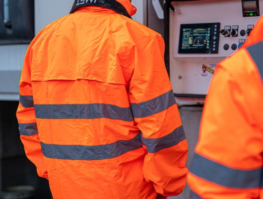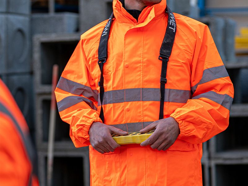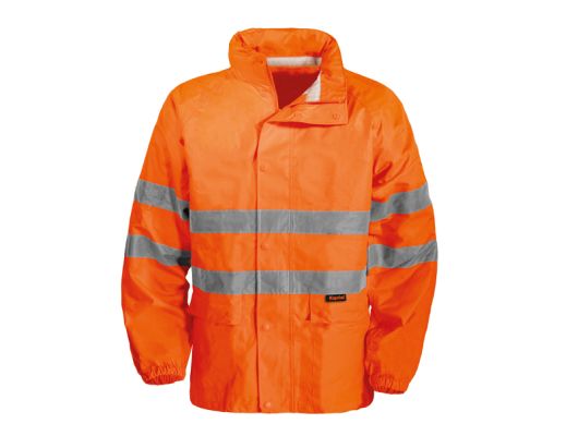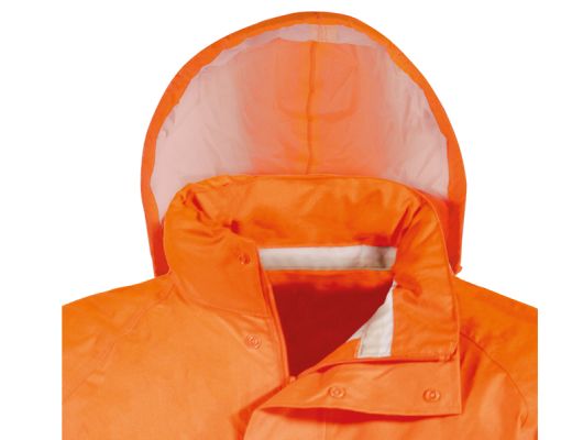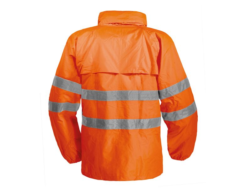 EN ISO 20471:2013 + A1:2016 EN 343:2019 visoka vidljivost , zaštita od kiše kišna jakna sa kapuljačom visoke vidljivosti 100 % poliester 300D Oxford PU sloj 175 g/m2 regular fit WATER PROOF , WIND PROOF - zaštita od vjetra i kiše tkanina otporna na kidanje i trošenje (wearproof) džepovi naprijed na preklop dvostruko zatvaranje ( patent + dugmad ) HV trake 5 cm rukavi sa elastičnom trakom