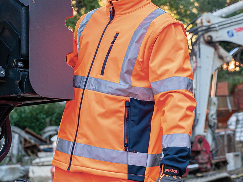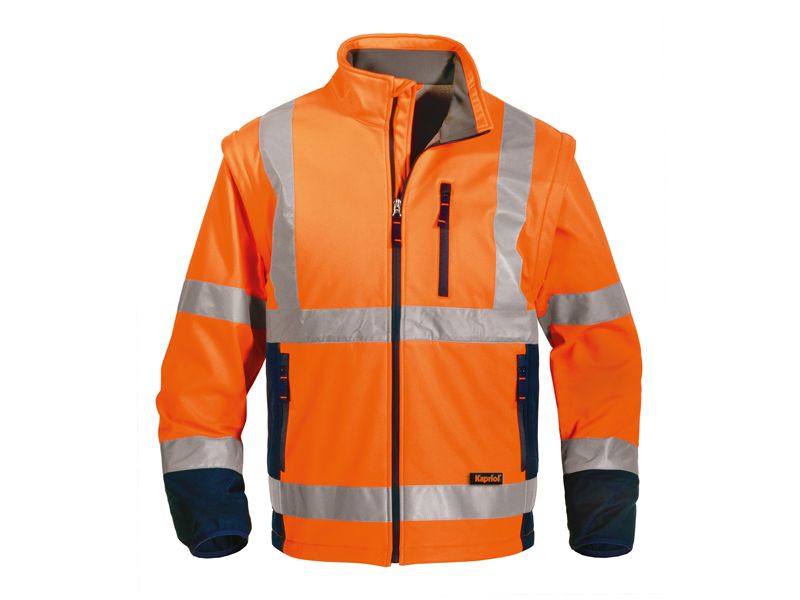 EN ISO 20471:2013 + A1:2016 visoka vidljivost jakna 2 u 1 : softshell jakna + softshell prsluk mogućnost skidanja rukava i onda se koristi samo radni HV prsluk glavna tkanina:100 % poliester softshell 290 g/m2 regular fit COLD PROOF , WIND PROOF - zaštita od hladnoće, vjetra i kiše udobna i izdržljiva, reflektirajuća radna softshell jakna ili softshell prsluk tkanina otporna na kidanje i trošenje (wearproof) džepovi sa patentom u struku okomiti džep sa patentom visoko na grudima HV trake 5 cm